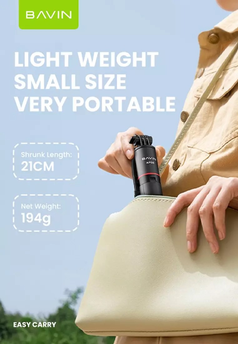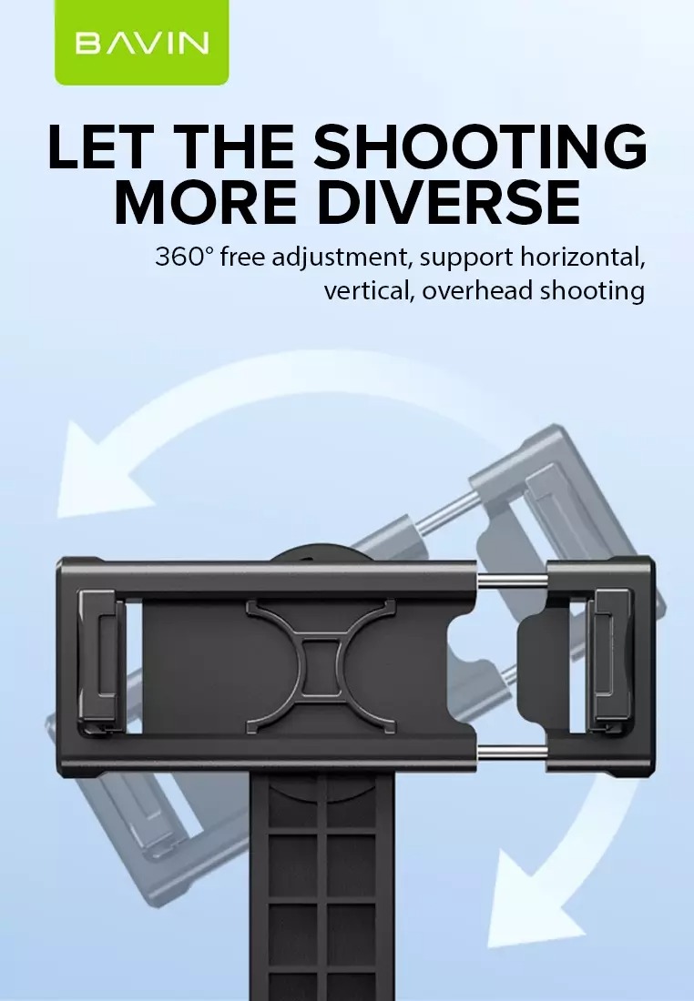 سه پایه باوین Bavin AP-08 با قابلیت چرخش 360 درجه و تنظیم آزادانه، به کاربران این امکان را می‌دهد که به راحتی بین حالت‌های افقی، عمودی و حتی زاویه‌های خاص جابجا شوند. این ویژگی در مونوپاد و سه پایه Bavin AP-08، انعطاف‌پذیری بالایی را در انتخاب زوایا و ثبت تصاویر خلاقانه فراهم می‌کند.