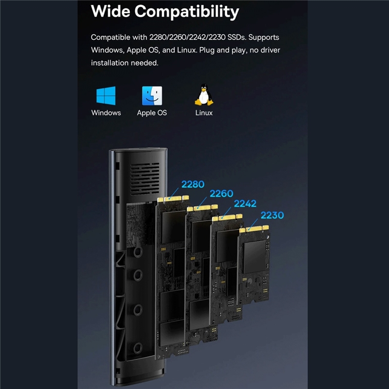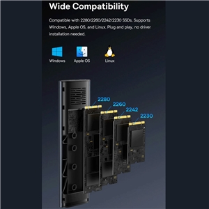 قاب SSD و هارد بیسوس با پشتیبانی از سرعت انتقال 10 گیگابیت بر ثانیه، جابه‌جایی داده‌ها را با نهایت سرعت و عملکرد بی‌نقص ممکن می‌سازد. علاوه بر این، سازگاری با SSDهای M.2 NVMe در اندازه‌های 2280، 2260، 2242 و 2230، این محصول را به یک راهکار ایده‌آل برای ذخیره‌سازی حرفه‌ای تبدیل کرده است.