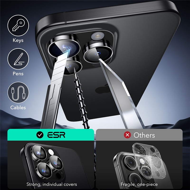 محافظ لنز ESR از شیشه حرارت‌دیده با مقاومت بالا ساخته شده که توانایی تحمل ضربات تا ۱۱۰ پوند را دارد. این ویژگی باعث می‌شود لنز دوربین شما در برابر خط و خش، ضربات و سایش‌های روزمره کاملاً ایمن باشد.