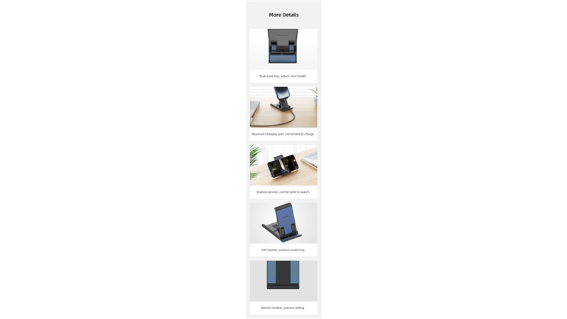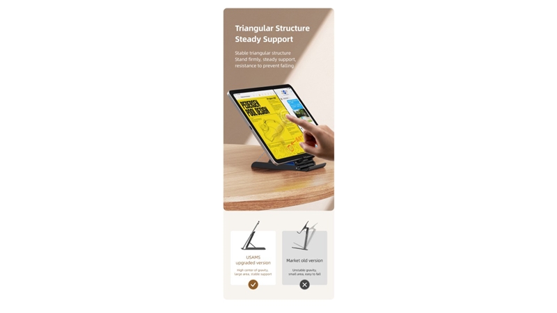 این پایه با طیف وسیعی از گوشی‌ها و تبلت‌ها تا سایز 12.9 اینچ سازگار است و به لطف طراحی تاشو، قابلیت حمل آسان را فراهم می‌کند. همچنین، قسمت زیرین آن دارای پد ضد لغزش است که ثبات بالایی روی میز یا هر سطح صاف ایجاد می‌کند.
