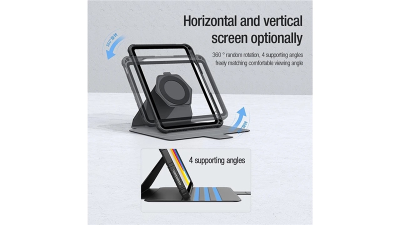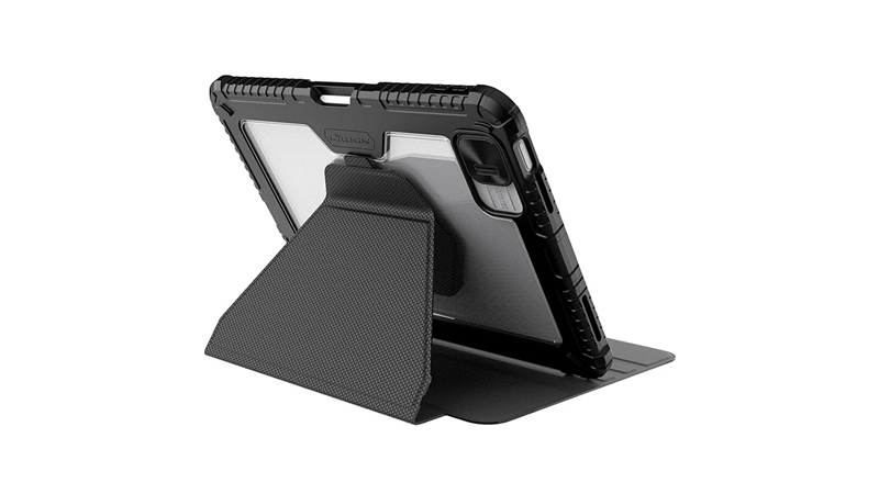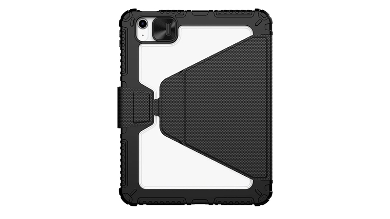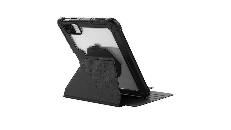 بخش پشتی این کیف از جنس پلیکربنات سخت ساخته شده که در برابر ضربه و خط و خش مقاومت بالایی دارد و لبههای تقویتشده آن از آیپد در برابر افتادنهای ناگهانی محافظت میکنند. روکش جلویی کیف نیز به صورت تاشو طراحی شده و امکان استفاده از حالت استند چند زاویهای را برای تماشای فیلم، مطالعه یا تایپ آسان فراهم میسازد.