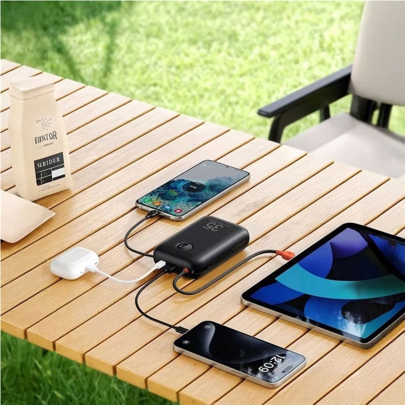 سایر توضیحاتخروجی قدرتمند PD35W – شارژ سریع آیفون، آیپد، مک‌بوک ایر، گوشی‌های اندرویدی و بسیاری از لپ‌تاپ‌ها. ابعاد فوق‌العاده کوچک – اندازه 118x72x25.4 میلی‌متر، مناسب حمل در جیب یا کیف. وزن سبک – تنها 297 گرم، ایده‌آل برای سفر و استفاده روزمره. کابل‌های داخلی – مجهز به کابل Lightning و Type-C داخلی، بدون نیاز به حمل کابل اضافی. نمایشگر LED – نمایش لحظه‌ای درصد شارژ باتری. فناوری شارژ سریع 30 وات – خروجی تایپ C برای شارژ سریع گوشی و لپ‌تاپ.