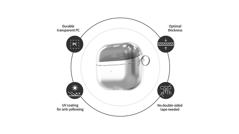 یکی از مهم‌ترین ویژگی‌های این قاب، طراحی شفاف و کریستالی آن است. این طراحی باعث می‌شود ظاهر اصلی کیس Galaxy Buds3 یا Buds3 Pro کاملاً دیده شود و در عین حال محافظت کامل نیز فراهم شود. ساختار این کاور به‌گونه‌ای طراحی شده که کاملاً روی کیس فیکس می‌شود و از لغزش یا جدا شدن جلوگیری می‌کند.