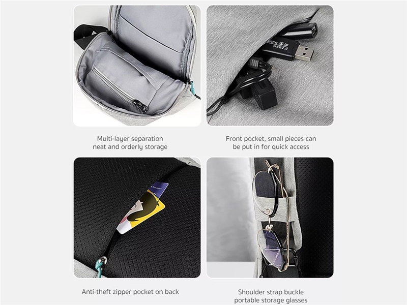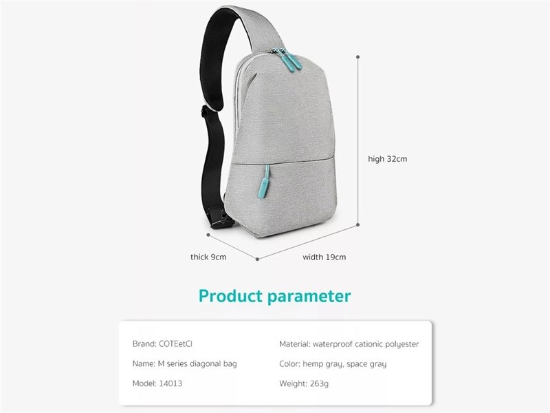 کوله پشتی تک بند کوتتسی Coteetci 14013 دارای ابعاد 9*19*32 سانتی متر و وزن آن برابر 236 گرم است که فضای بسیار خوبی برای وسایل های کوچک و مهم است. کوله یک طرفه کوتتسی 14013 دارای 2 جیب زیپ دار که یکی در قسمت جلویی کیف طراحی شده که مناسب برای قرار دادن گوشی ، کابل شارژ کلید و... است. جیب دیگری که جیب اصلی این کیف بوده دارای محفظه های بسیار کوچک است که بتوانید به چیدمان وسایلاتان نظم دهید.