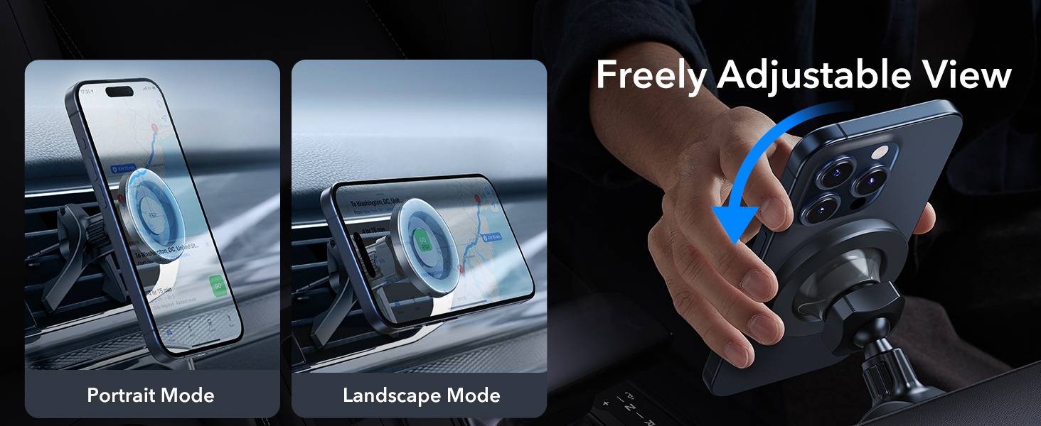 زاویه دید قابل تنظیم: حلقه کاملی از مغناطیس‌ها امکان انتخاب بین حالت‌های نمایش عمودی یا افقی را فراهم می‌کند، در حالی که مفصل گردان‌پذیر به شما دسترسی به یک دایره گسترده از زوایا را می‌دهد تا همیشه یک دید راحت داشته باشید.