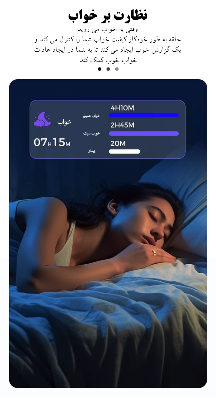 یکی از ویژگیهای برجسته حلقه هوشمند VR11، پایش سلامت ۲۴ ساعته است. این حلقه مجهز به حسگرهای پیشرفته برای اندازهگیری ضربان قلب، اکسیژن خون، فشار خون و حتی پایش استرس میباشد. با این قابلیتها، میتوانید به صورت دقیق از وضعیت جسمانی خود مطلع شوید و هرگونه تغییرات را به سرعت شناسایی کنید. همچنین، پایش خواب به شما کمک میکند تا الگوی خواب خود را تحلیل کرده و به بهبود کیفیت خواب بپردازید.