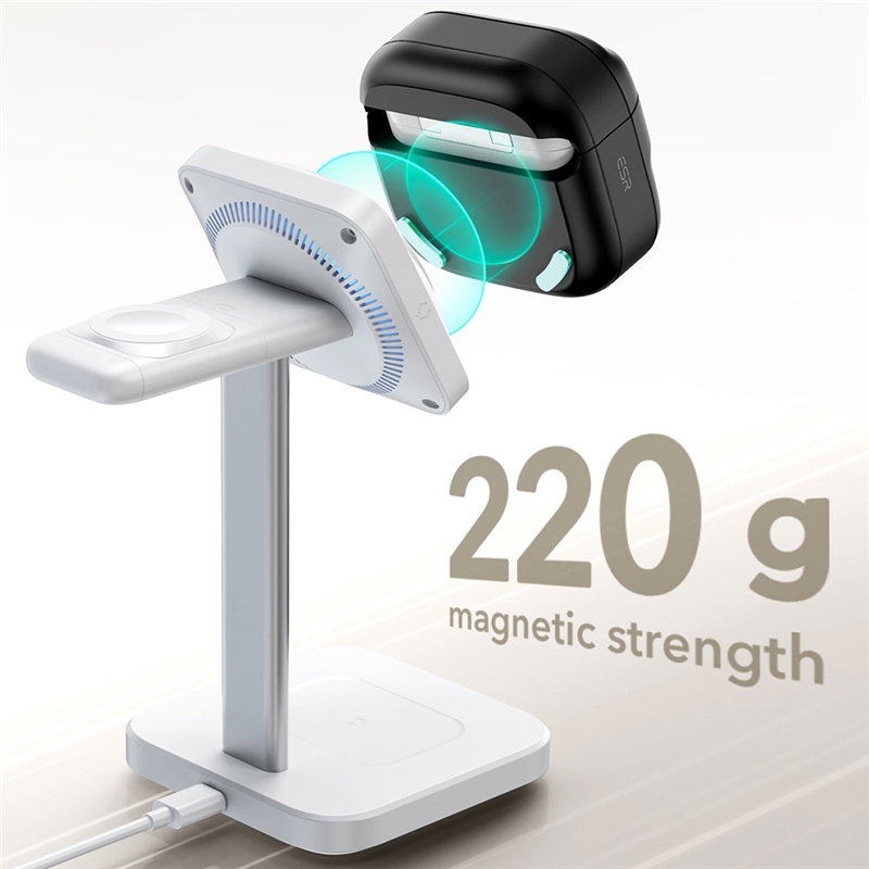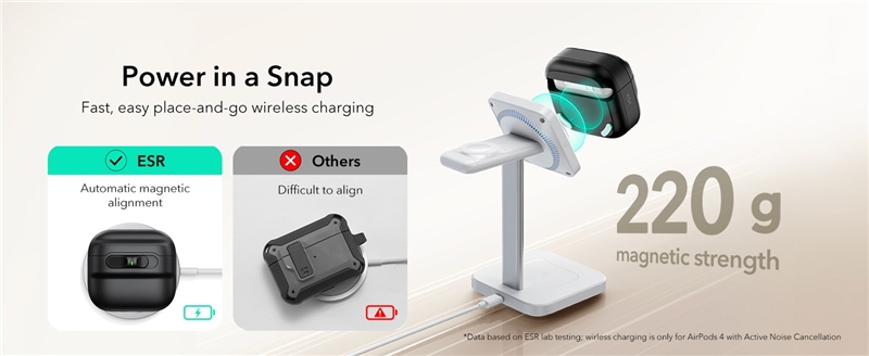 کاور ایرپاد ۴ ESR به طور کامل از شارژ بی‌سیم MagSafe پشتیبانی می‌کند. آهن‌رباهای قوی در قسمت پشت کاور به راحتی با شارژرهای MagSafe هم‌راستا شده و شارژ بی‌سیم سریع و راحتی را فراهم می‌کنند. این ویژگی مخصوصاً برای کسانی که از ایرپاد ۴ با قابلیت لغو نویز فعال استفاده می‌کنند، بسیار مفید است.