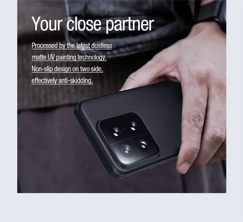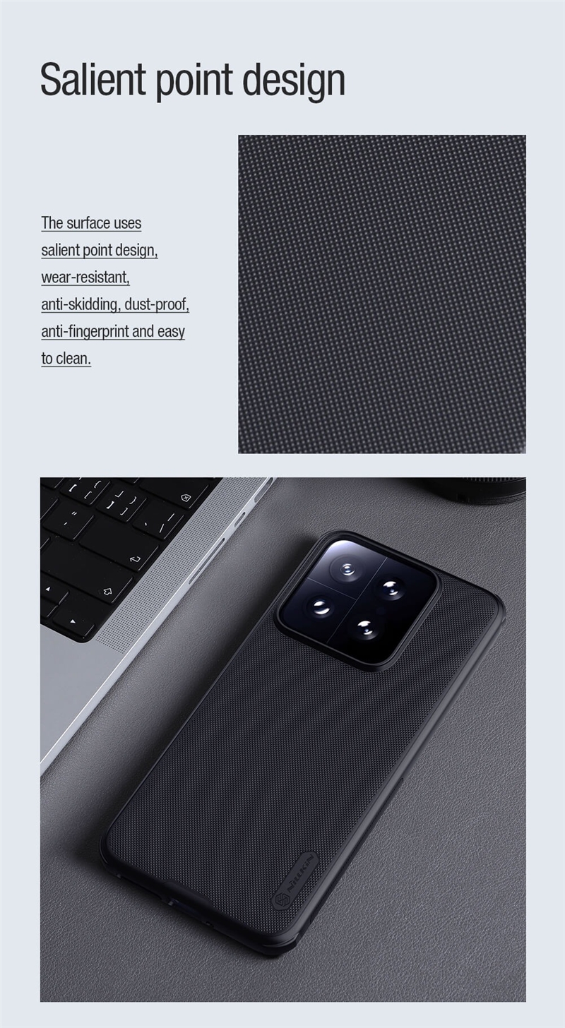 سطح قاب نیلکین فراستد شیلد شیائومی 14 تی پرو با برجستگی های نقطه ای پوشانده شده که باعث عدم لغزیدن گوشی هنگام کار با آن می شود این کاور به خوبی از قاب پشتی و لبه های جانبی گوشی محافظت می کند. مدل های Frosted Shield Pro همانند سایر محصولات برند نیلکین از کیفیت ساخت بالایی برخوردار است و با دقت بالایی بر اساس ابعاد و اندازه های گوشی طراحی و ساخته شده. هر دو طرف قاب، مات بوده و مقاوم در برابر ضربه، شوک، گرد و غبار و اثر انگشت است.
