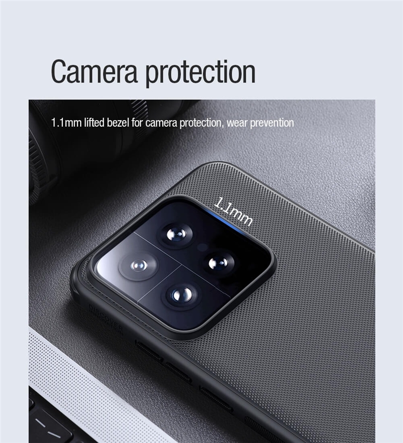 همچنین در قسمت اطراف دوربین پشتی قاب نیلکین Xiaomi 14T Pro Nillkin Frosted Shield Pro، برآمدگی ایجاد شده تا زمانی که گوشی خود را روی میز قرار می دهید بیرون زدگی دوربین پوشش داده شود و در واقع قاب روی میز قرار بگیرد نه گوشی شما... ضخامت این لبه برابر است با 0.5 میلی متر که مقدار مناسبی را پوشش می دهد.