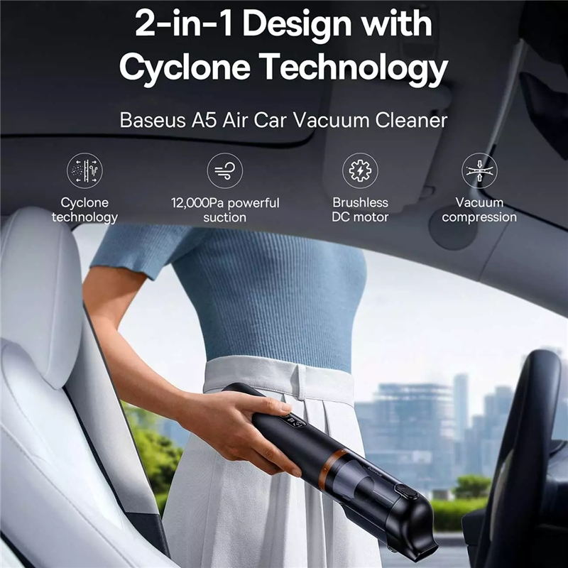 جاروشارژی Baseus A5 Car Vacuum Cleaner C30459500111-00 به صورت بی سیم طراحی شده تا شما بتوانید به راحتی و در هرجایی از آن استفاده کنید؛ این جارو با باطری 7500 میلی آمپری و توان بالا تا 35 دقیقه زمان تمیز کردن را افزایش داده این امکان را به شما میدهد تا حس خوب تمیز شدن را تجربه کنید.