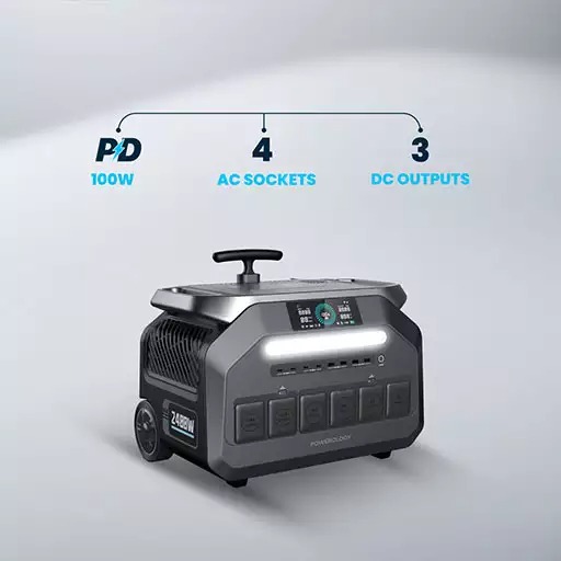 خروجی برق3 عدد خروجی DC, 4 عدد خروجی USB-A, 4 عدد خروجی USB-C, 4 عدد خروجی برق 220 ولت AC مجموعا با توان 2،400 وات در حالت عادی و 4،800 وات در حالت پیک