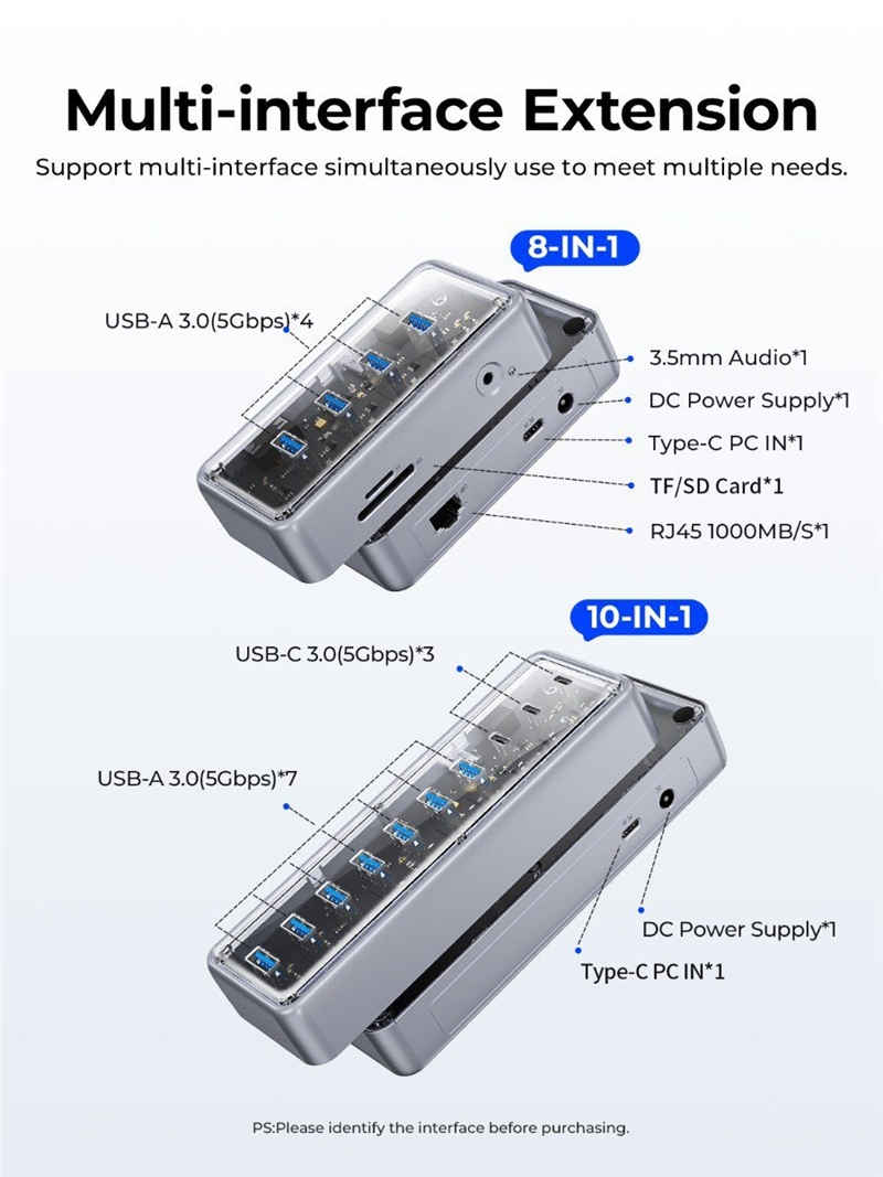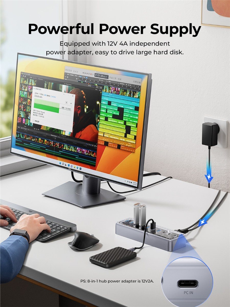 داک استیشن ۱۰ پورت با رابط برق DC12V/4A کار می‌کند که به آن اجازه می‌دهد تا به طور همزمان چندین دستگاه را تغذیه کند. این منبع تغذیه قوی به ویژه برای کاربرانی که از چندین دستگاه به طور همزمان استفاده می‌کنند بسیار مفید است و از بروز مشکلات ناشی از کمبود برق جلوگیری می‌کند.