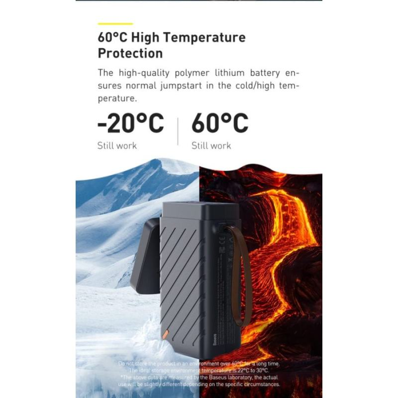 جامپ استارتر باسئوس دارای ولتاژ 12 ولت است و برای استارت در عرض 2 ثانیه توانی معادل 800 آمپر وارد میکند. بالاترین شدت جریان این جامپ استارت نیز 1600A میباشد. شیوه اتصال دستگاه بدین صورت است که باید ابتدا کابل را به جامپ استارتر متصل کرده و طرف دیگر آن که شامل دو گیره است را به سمت مثبت و منفی باتری وصل کنید. پس از مطمئن شدن از اتصال صحیح، باید استارت ماشین را بزنید و بلافاصله جامپ استارتر را جدا کنید. حالا با خیال راحت می توانید رانندگی کنید. گیرههای اتصال به باتری ماشین از جنس مس بوده و رسانایی بالایی دارند. پوشش بیرونی آنها نیز محکم بوده و در مقابل شکستن مقاوم است. این جامپ استارتر میتواند دستگاههایی که زیر 100 وات توان دارند مانند پنکه های برقی، یخچالهای کوچک و .. را نیز شارژ کند. باتری لیتیوم یونی این دستگاه با ظرفیت 16000 میلی آمپر ساعتی خود دارای دو پورت USB و تایپ سی است که توانایی شارژ دستگاه هایی مثل موبایل و تبلت را با توانی معادل 5V/4.5A و 5V/3A دارد. برای شارژ این دستگاه بهتر است از آداپتور 65 وات به بالا و یک کابل استاندارد استفاده کنید. مدت زمان لازم برای کامل شدن باتری این جامپ استارتر باسئوس 1.5 ساعت است و میتواند تا 20 مرتبه بعد از ان استفاده شود. در قسمت جانبی بدنه جامپ استارتر باسئوس CRJS02-A0G تعداد 4 درگاه وجود دارد. درگاه اول پورت خروجی DC برای اتصال دستگاههایی مانند پنکه است. درگاه دوم پورت مشترک وروردی و خروجی تایپ سی بوده و برای شارژ کردن گوشیها، مک بوک و تبل ت کاربرد دارد. شدت جریان ورودی و خروجی این پورت حداکثر 5V/3A میباشد. درگاه سوم نیز پورت خروجی USB است و قادر است با شدت جریان 4.5V/5A گوشیها و تبلتها را شارژ کنید. در کنار این درگاهها یک سری چراغ LED طراحی شده که میزان شارژ دستگاه را مشخص میکند. درگاههای آخر نیز پورتهای خروجی AC هستند که 110V-50Hz بوده و برای شارژ کردن لپ تاپها، یخچال ماشینها، لامپهای رومیزی و .. استفاده میشوند. در بسته بندی این پاوربانک علاوه بر خود محصول، یک شارژر فندکی QC با توان 63 وات، یک کابل شارژ Type C به Type C و یک کابل EC8 که یک طرف آن برای اتصال به جامپ استارتر و طرف دیگر دو گیره برای اتصال به سری های + و - باتری ماشین قرار داده شده است.