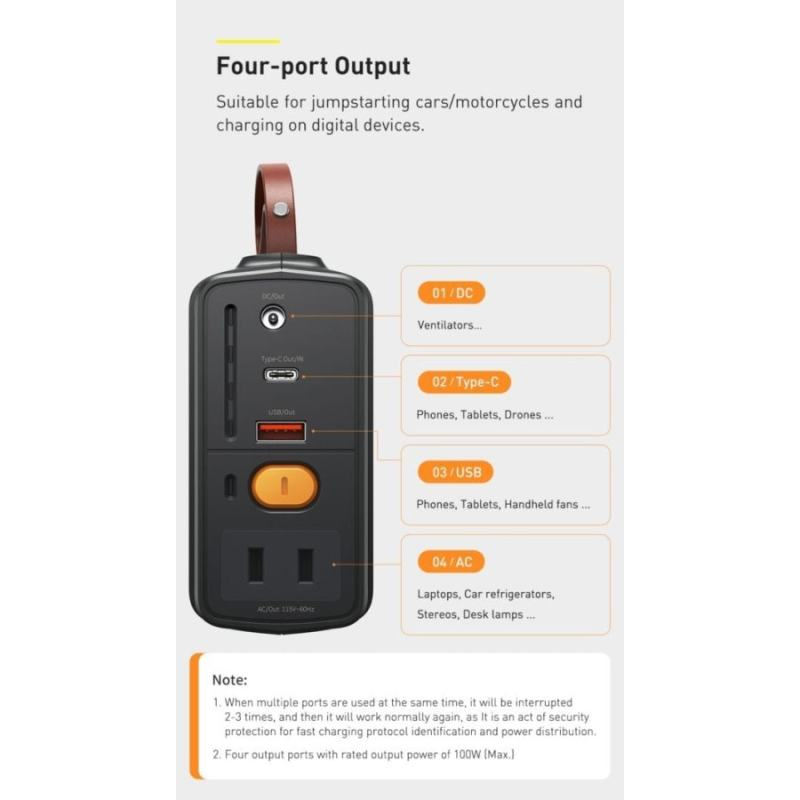 تعداد درگاه خروجی : ۴ ابعاد:۱۸۰ × ۹۰ × ۳۵ میلی متر وزن : ۱۸۰۰ گرم دارای یک خروجی USB و یک خروجی جهت استارتر ماشین دارای چراغ قوه با سه حالت نوردهی توان خروجی کلی : ۱۰۰ وات شدت جریان خروجی : جامپ استارتر: ۸۰۰ تا ۱۶۰۰ آمپر و ۱۲ ولت | یو اس بی: ۴.۵V/۵A | خروجی DC: ۱۲-۱۶.۸V/۸A | خروجی AC: ۱۱۰V/۱۰۰W شدت جریان ورودی : تایپ سی: ۵V/۳A نوع دوشاخه : درگاه AC این جامپ استارتر هم از پریز CN و هم EU پشتیبانی میکند شارژر فندکی داخل بسته بندی دارای دو خروجی Type C و USB A میباشد که از استاندارد QC پشتیبانی کرده و دارای توان ۱۸ و ۴۵ وات میباشند | کابل شارژ نیر توان ۶۰ وات ۲۰V/۳A دارد ظرفیت اسمی باتری ظرفیت اسمی: ۱۶۰۰۰ میلی آمپر ساعت | ظرفیت واقعی: ۴۰۰۰ میلی امپر ساعت نوع درگاه خروجی : USB A | تایپ سی (مشترک ورودی و خروجی) | AC | DC