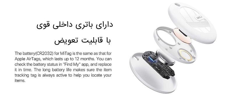 4. باتری قابل تعویض: MiLi MiTag با باتری CR2032 کار می‌کند که قابل تعویض است و عمر باتری آن تا 12 ماه است. شما می‌توانید وضعیت باتری را در نرم‌افزار "Find My" مشاهده کنید و هنگام نیاز، باتری را تعویض کنید. این ویژگی به شما اطمینان می‌دهد که ردیاب همیشه فعال است و به شما در پیدا کردن اشیاء کمک می‌کند.