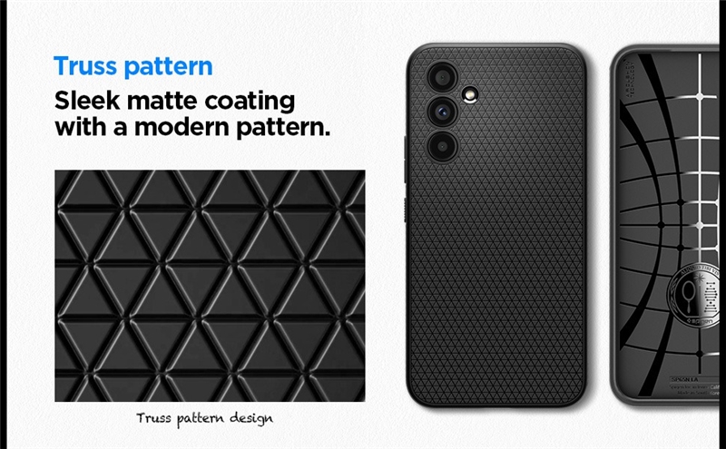 قاب اسپیگن Spigen Liquid Air Case Samsung Galaxy A54 5G دارای پوشش مات سیاه با الگوی هندسی است که به آن ظاهری مدرن و مقاوم در برابر اثر انگشت میبخشد. لبههای بالایی این قاب به طور استراتژیک بر روی صفحه نمایش و دوربین قرار میگیرند تا در صورت قرار گرفتن گوشی بر روی سطوح صاف، آنها را حفظ کنند.