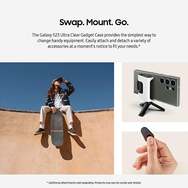 این کاور اصلی برند سامسونگ از جنس پلاستیک سخت ساخته شده و دارای یک گیریپ و درپوش می باشد و به دلیل داشتن برش ها و اندازه هایی دقیق به خوبی از گوشی شما محافظت کرده و در ورودی پورت ها اجازه دسترسی آسان به درگاه های گوشی تلفن همراه را امکان پذیر می کند. جنس به کار رفته در کاور Clear Gadget سامسونگ Galaxy S23 Ultra باعث می شود که گوشی به خوبی در دستان شما قرار گرفته و مشکلی از بابت لیز خوردن گوشی از دستتان نخواهید داشت. نکته قابل توجه در مورد این محصول آن است که درون بسته بندی یک قاب به همراه یک نگهدانده و یک درپوش که هر دو قابلیت تعویض دارند، قرار داده شده است.