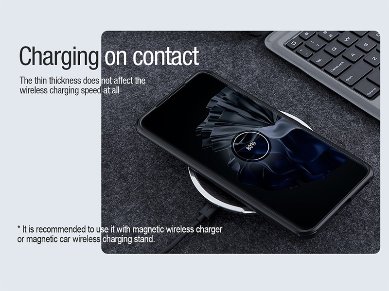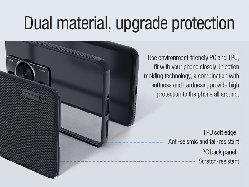 جنس کاور محافظ نیلکین Frosted Shield Pro از پلاستیک سخت PC و همین طور TPU سازگار با محیط زیست است. همین مسئله باعث شده تا این قاب علاوه برا دارا بودن جنسی خشک و سخت که بیشتر می توان آن را در قسمت پشتی قاب حس کرد، لبه هایی منعطف نیز داشته باشد و در برابر ضربات احتمالی از مقاومت بالایی برخوردار باشد. دور تا دور قاب از جنس TPU ساخته شده است، بنابراین می توان گفت که انعطاف پذیر بودن آن کمی باعث شده تا در برابر ضربه از خاصیت ارتجاعی خوبی برخودار باشد و به خوبی بتواند ضربه را تا حد زیادی دفع سازد. این قاب بصورت کامل قسمت پشتی و تمام اطراف گوشی شما را پوشش می دهد و فقط در قسمت های مورد نیازی مثل اسپیکر، میکروفون، دوربین و سنسورهای دیگر برش CNC خورده است. قابل توجه است که کلیدها نیز دارای پوشش هستند تا به خوبی و به طور کامل از آن ها محافظت شود. با این حال کار با آن ها همچنان راحت بوده و می توانید راحتی کاربرد گذشته خود را با آن ها داشته باشید. این نکته را در نظر داشته باشید که قاب در قسمت هایی که پورت وجود دارد، پوششی نداشته تا مانعی برای اتصال کابل و... برای شما ایجاد نکند.